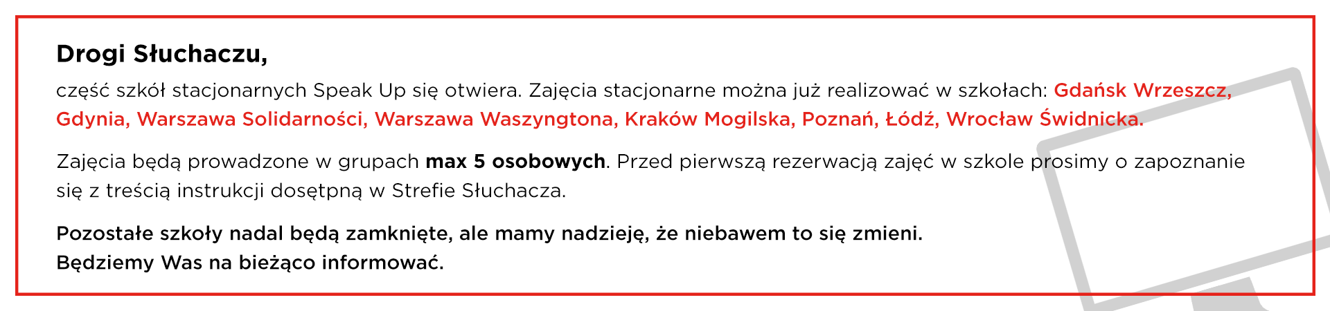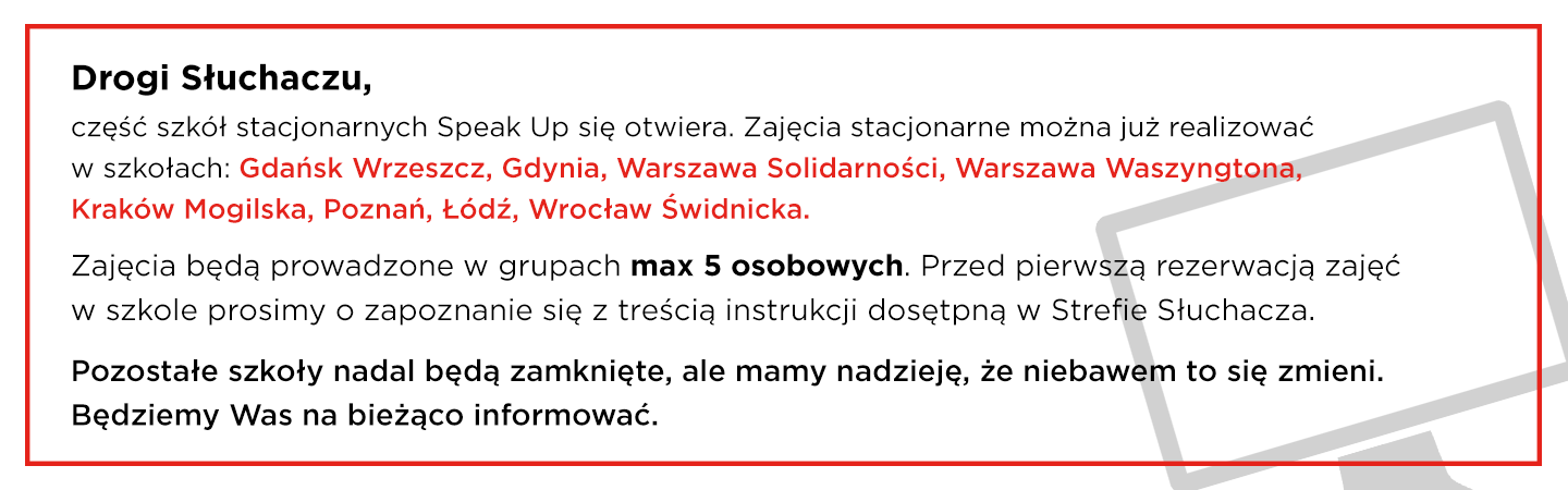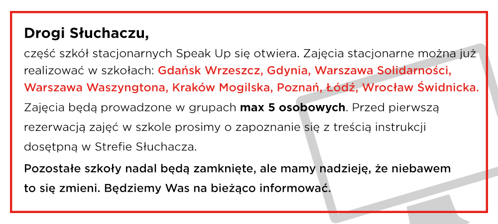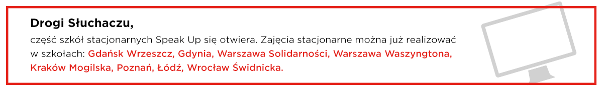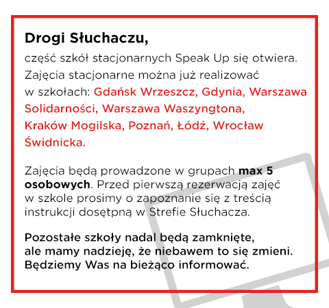 Jestem mega zadowolony z zajęć jakie są w szkole Speak up. Gorąco polecam każdemu. Szukałem kursu, gdzie mógłbym ćwiczyć głównie konwersację, najlepiej z różnymi osobami aby poznać różnej akcenty oraz nie wychodząc z domu aby nie tracić czasu na dojazdy. Znalazłem to czego szukałem a nawet dużo więcej. Gorąco polecam.